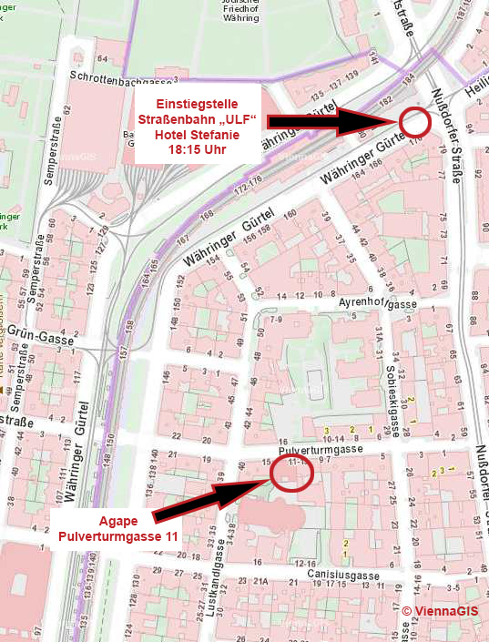 Abfahrtstelle: Straßenbahn-Haltestelle "Nußdorfer Straße" am Inneren Währinger Gürtel (Kreuzung Währinger Gürtel x Nußdorfer Straße) - siehe Planausschnitt unterhalb! Bitte etwa 5-8 Minuten Fußweg einplanen!
